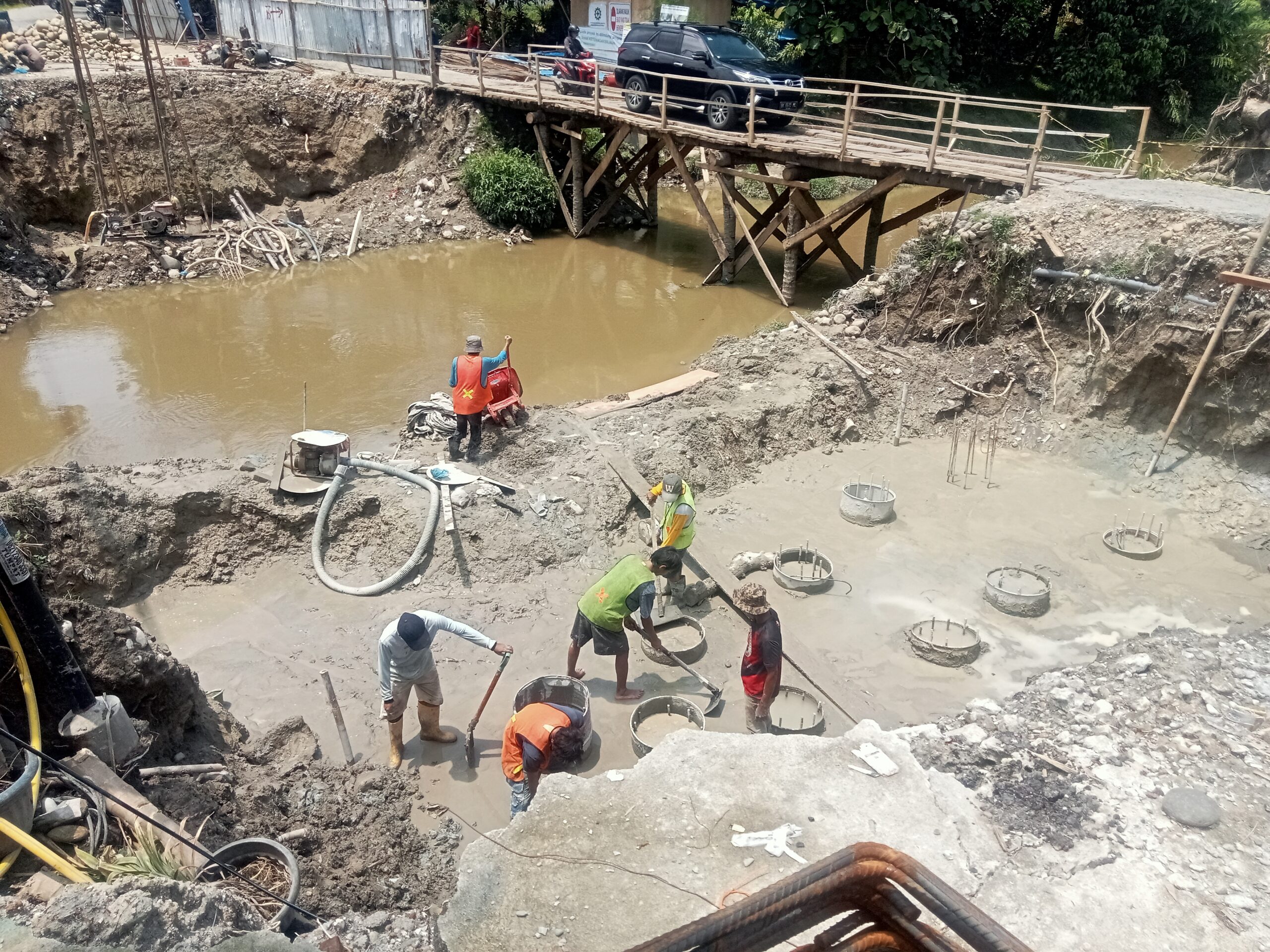 Proyek pembangunan jembatan tersebut saat ini tengah menjadi sorotan publik, menyusul munculnya berbagai pertanyaan mengenai pihak pelaksana kegiatan di lapangan.